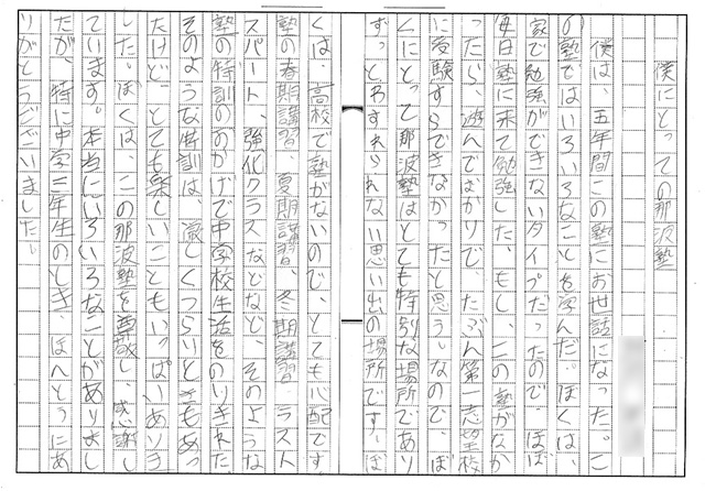 もし、この塾がなかったら、遊んでばかりで、たぶん第一志望校に受験すらできなかったと思う。なので、僕にとっての那波塾はとても特別な場所であり、ずっとわすれられない思い出の場所です。